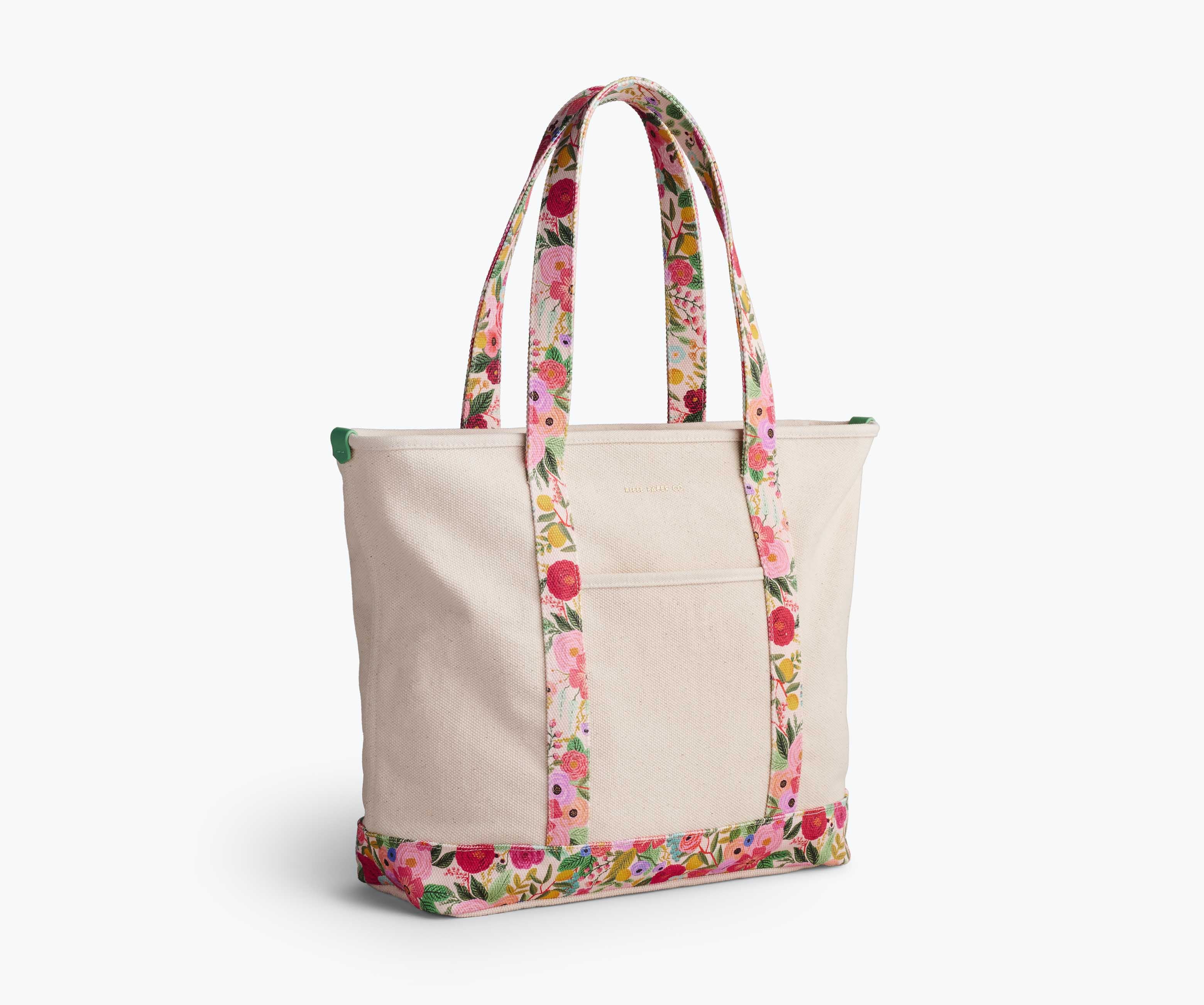 Never leave home without our sturdy canvas tote, featuring reinforced handles, floral accents, a zipper closure, and slip pockets for storage.