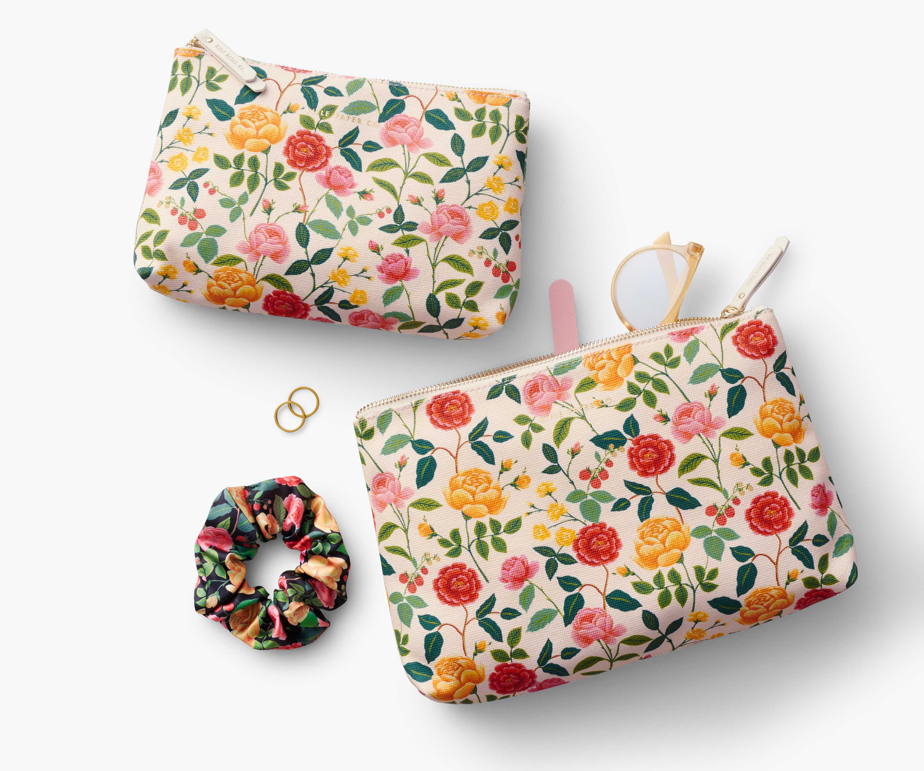 A set of two cotton canvas pouches featuring our illustrated Roses print. The pouches are spacious and lightweight, great for travel, organization, or tossing in your everyday bag.