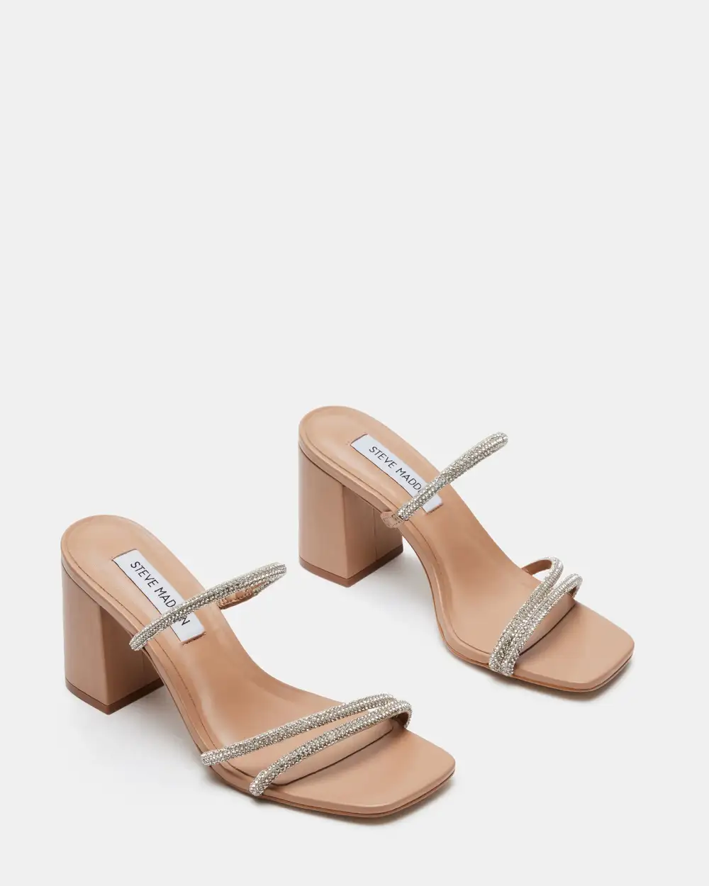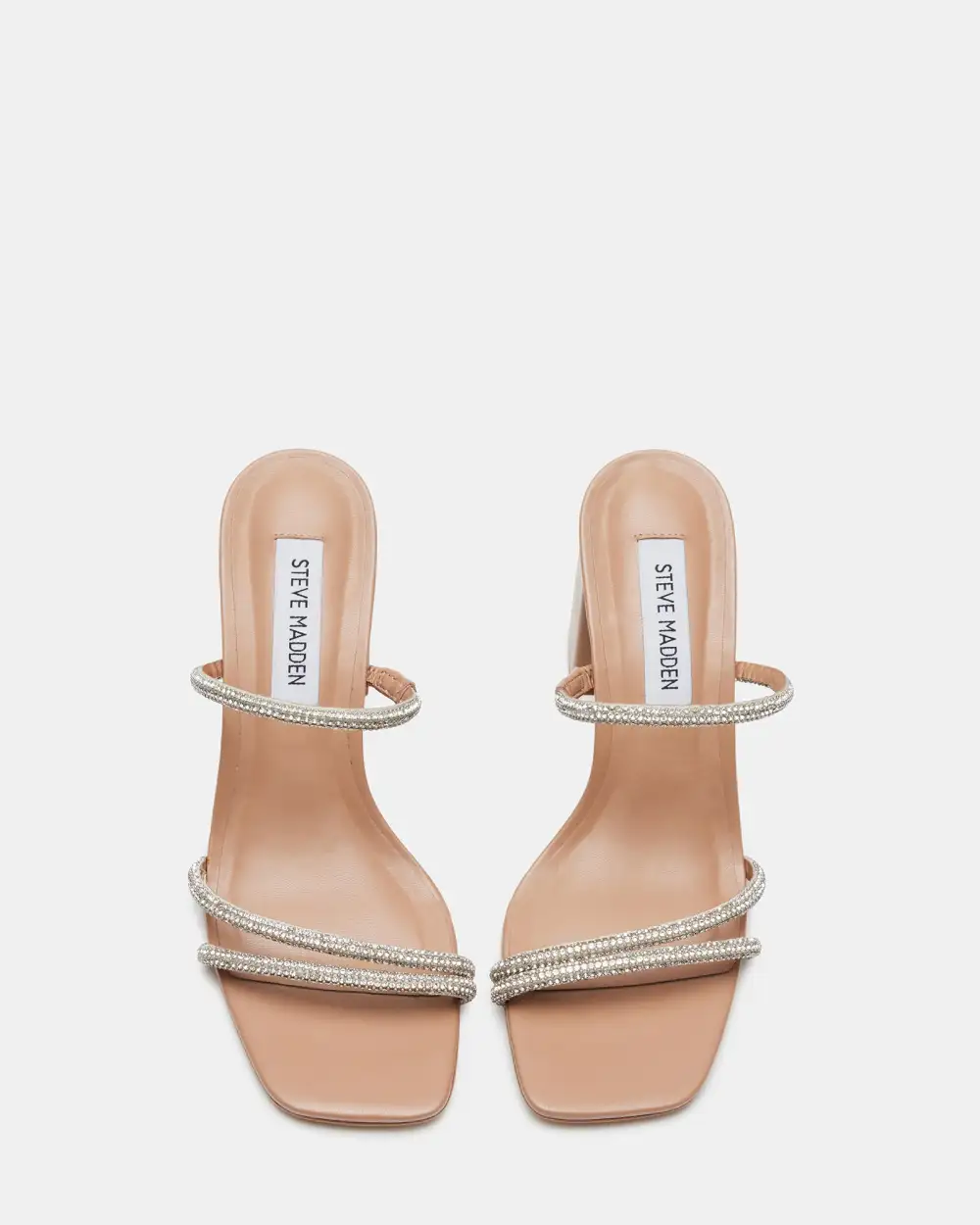 - Square toe block heel slide sandal with rhinestone embellishment